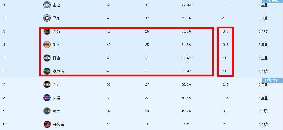 原本火箭输给掘金后,湖人排名一度上升至西部第三,然而随着森林狼输球这一排名重新变动,湖人排名又重新回到了西部第四。目前来看西部第三至第六的排位争夺已经进入白热化,火箭、湖人战绩同为40胜25负,掘金、森林狼战绩则同为40胜26负,每场比赛的结果都将直接影响排名,此外西部第七的太阳也仅仅只落后第六1.5个胜场,常规赛还是15场左右的比赛, 悬念还很大。这5支球队谁状态不好,将大概率跌入附加赛!